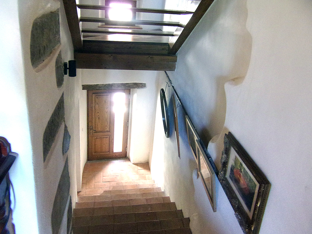 Indgangen ligger ud til landsbyens hovedgade, som er en hyggelig gågade uden trafik. Her træder man ind ad hoveddøren til en terracotta-belagt trappe og et praktisk opbevaringsrum – ideelt til cykler. Herfra er der adgang til et stort, lyst soveværelse med eget badeværelse med rummelig brusekabine i glas. Fra denne etage er udsigten over dalen ganske enkelt storslået. På etagen findes desuden teknikken vedr. det brændefyrede centralvarmeanlæg.