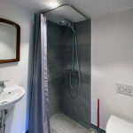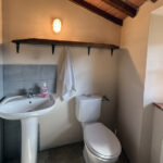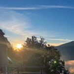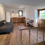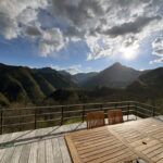 Man ankommer til 1. sal med badeværelse, master bedroom og endnu et soveværelse. Herfra fører trappen ned til et hyggeligt opholdsområde med køkken, stue og spiseplads samt toilet/vaskerum. Fra stuen er der direkte udgang til en fantastisk træterrasse i to niveauer – perfekt til lange aftener med udsigt over bjergene og dalen.